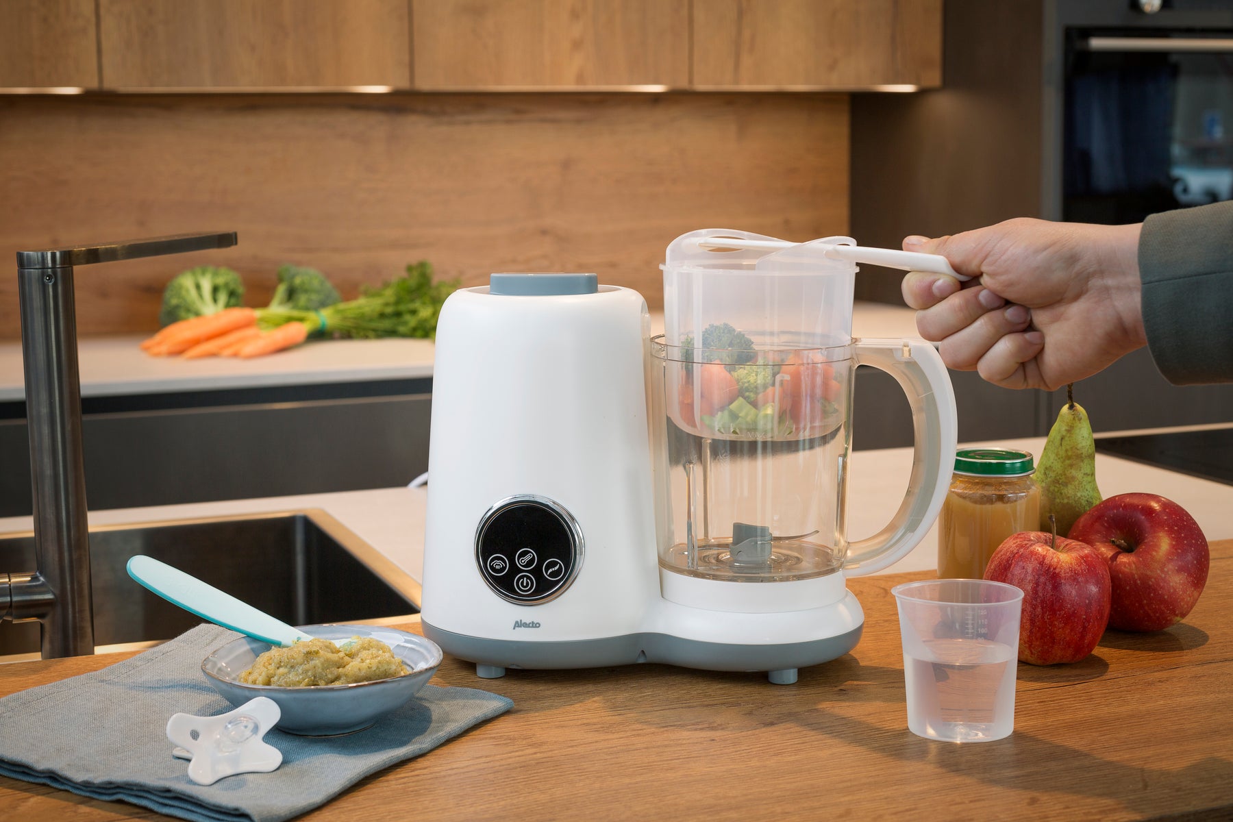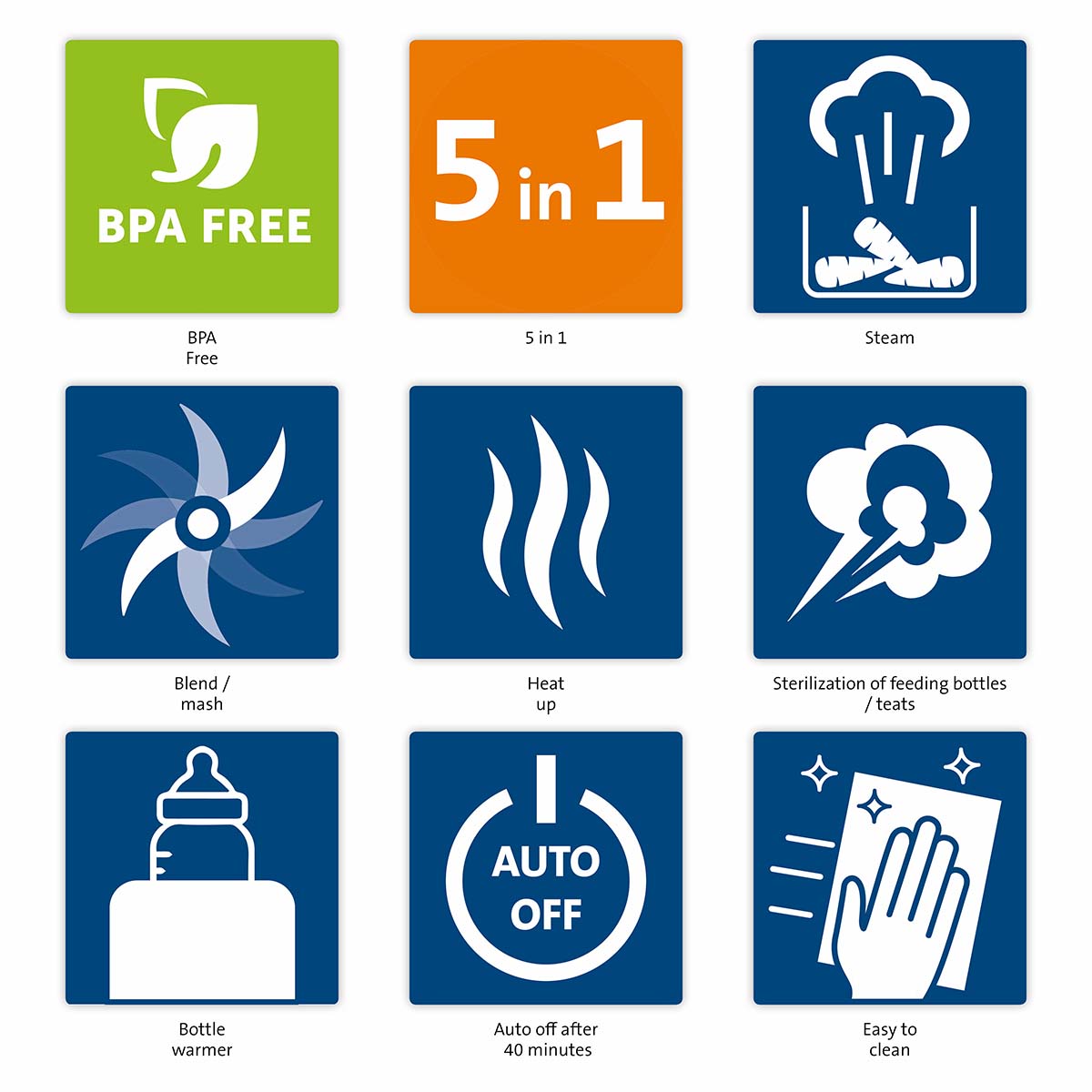 - 5 functies: stomen, pureren, opwarmen, flessenwarmer, steriliseren van flessen/spenen