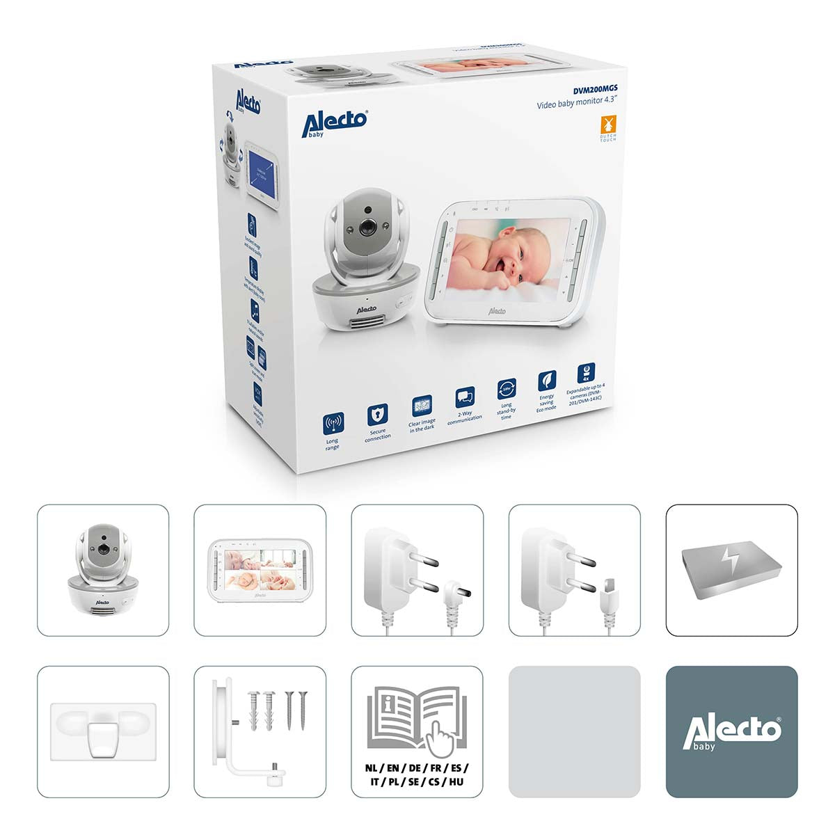 De Alecto Baby DVM200MGS is een babyfoon met camera met een uitstekende beeld- en geluidskwaliteit. De babyfoons uit de DVM-200 serie behoren al jaren tot de best verkopende babyfoons. Met de DVM200 kun je je kindje natuurlijk altijd horen én zien via de draadloze oplaadbare ouderunit. Op het grote 4.3” / 10,9 cm kleurenscherm zie je direct hoe het er aan toe gaat op de babykamer. En dat allemaal via de babyunit, de op afstand beweegbare camera met kristalhelder geluid en helder beeld, zowel overdag als ’s nachts. In totaal zijn er tot wel 4 camera’s op de ouderunit aan te sluiten (DVM200C). Naast alle essentiële functionaliteiten beschikt deze babyfoon over veel extra functies die deze babyfoon meer dan compleet maken.