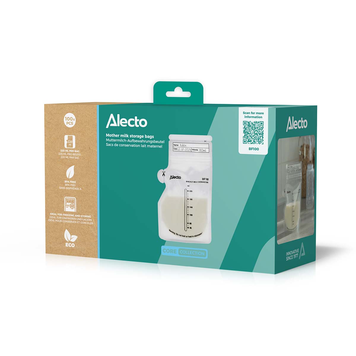 Daarnaast zijn de Alecto BF100 Moedermelk bewaarzakjes 100% lekvrij door de dubbele zipsluiting en hebben ze een handige schenktuit, waardoor je ze ook onderweg makkelijk kunt gebruiken.