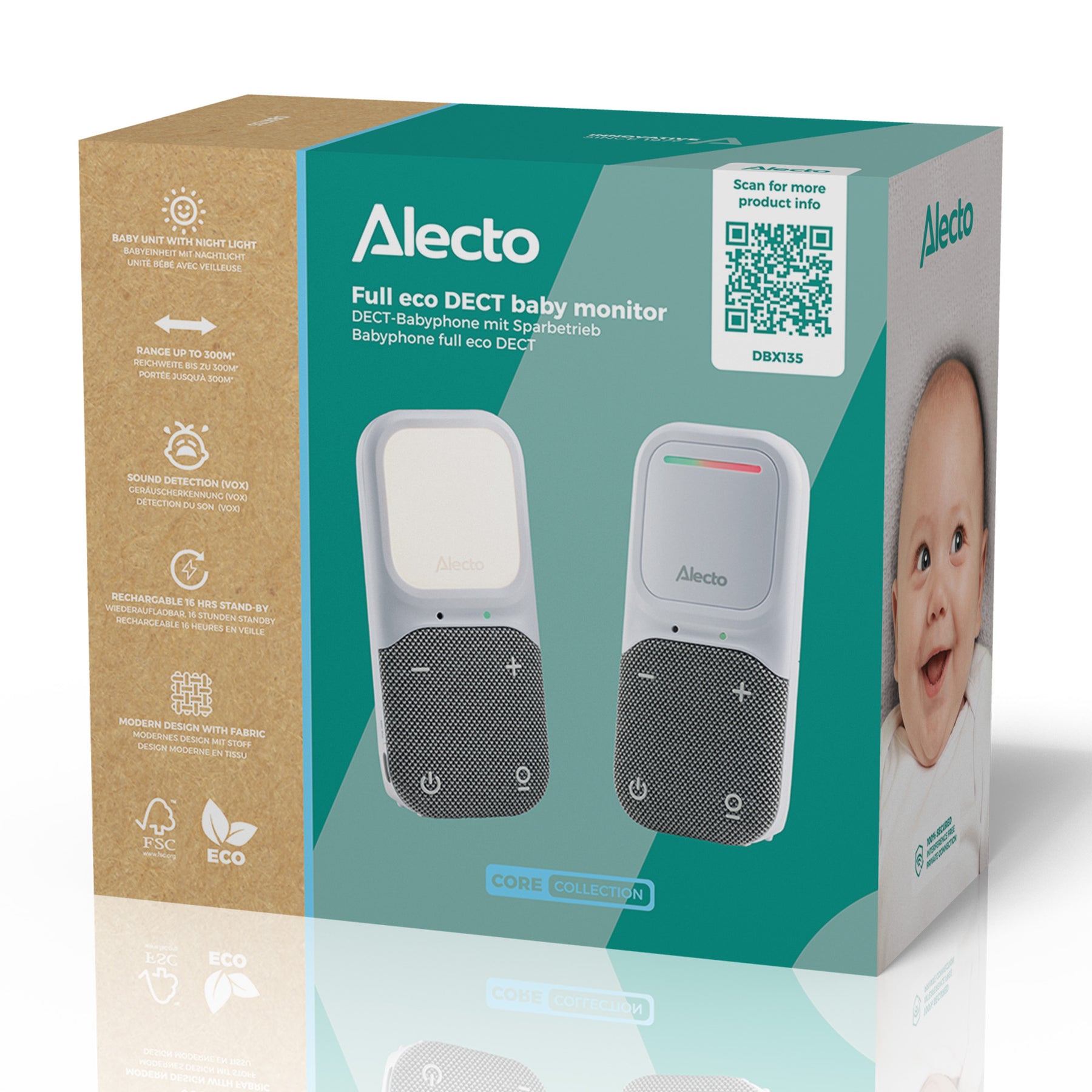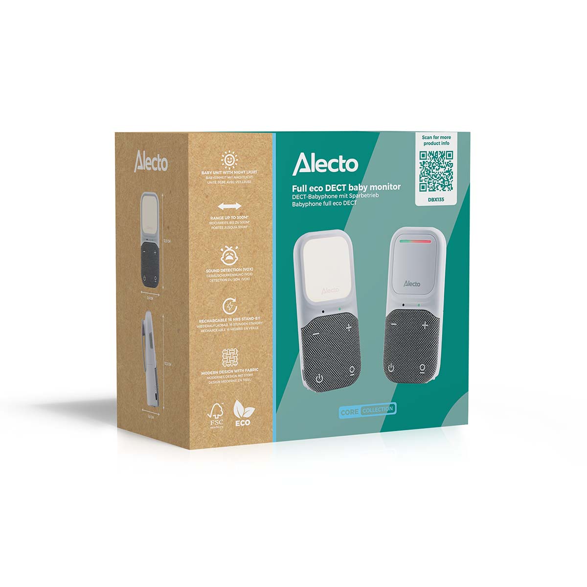 De slimme VOX-functie zorgt ervoor dat de babyfoon automatisch inschakelt wanneer er in de buurt van de babyunit geluid gedetecteerd wordt. De gevoeligheid van de microfoon kan worden ingesteld, waardoor je zelf bepaalt bij welk geluidsniveau de audio babyfoon actief wordt. Dit voorkomt onnodige activering door zacht achtergrondgeluid. Het Full Eco-karakter van de DBX135 bespaart energie en zorgt voor minimale straling. In de stand-by modus is er zelfs helemaal geen straling, want de units maken enkel verbinding met elkaar wanneer er geluid wordt gedetecteerd.