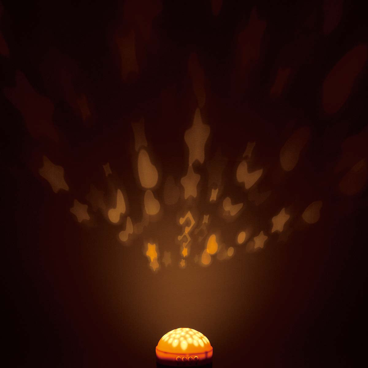 • 6 rustgevende geluiden: 2 slaapliedjes en 4 witte ruis geluiden.