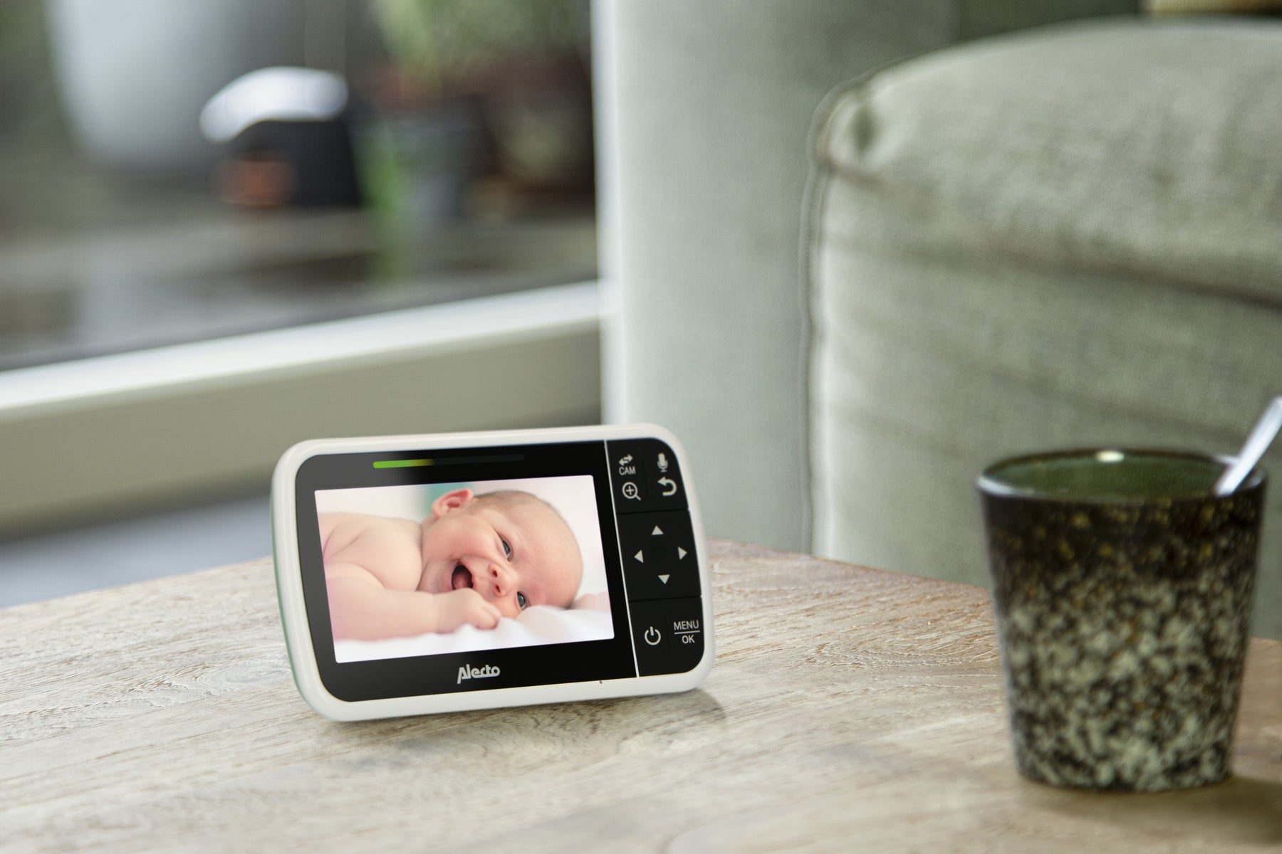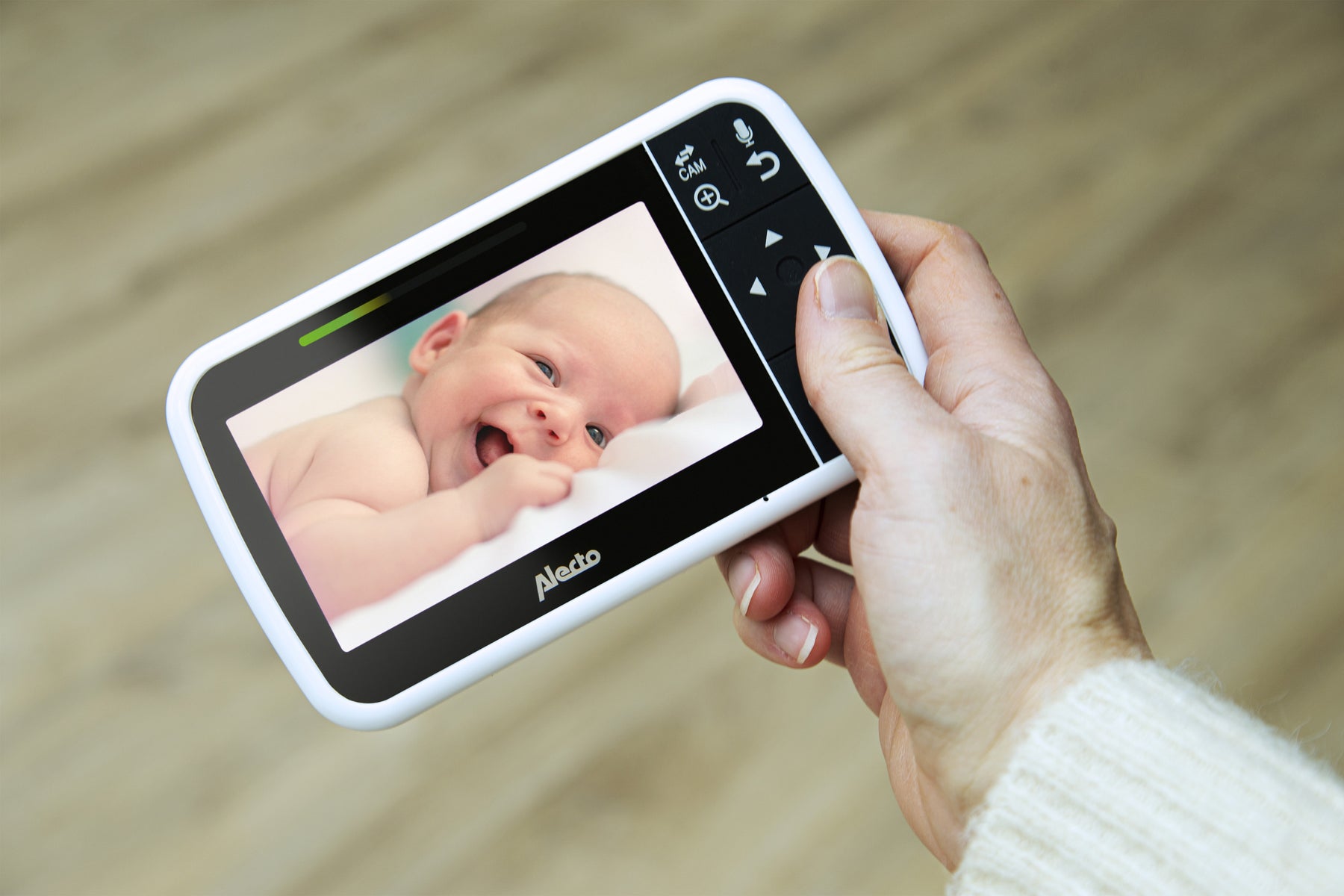 Want to be busy in the garden while your child takes a nap? Don't worry, because the handy Alecto Baby DVM149GN with camera gives you a broad range of up to 300 meters / 328 yards outside. On the 4.3" large screen, you can easily read the room’s temperature, so you know whether your child is too hot or too cold. The image and sound automatically turn on, with sound level lights that indicate how much noise your child makes. This way you can always keep an eye on things.