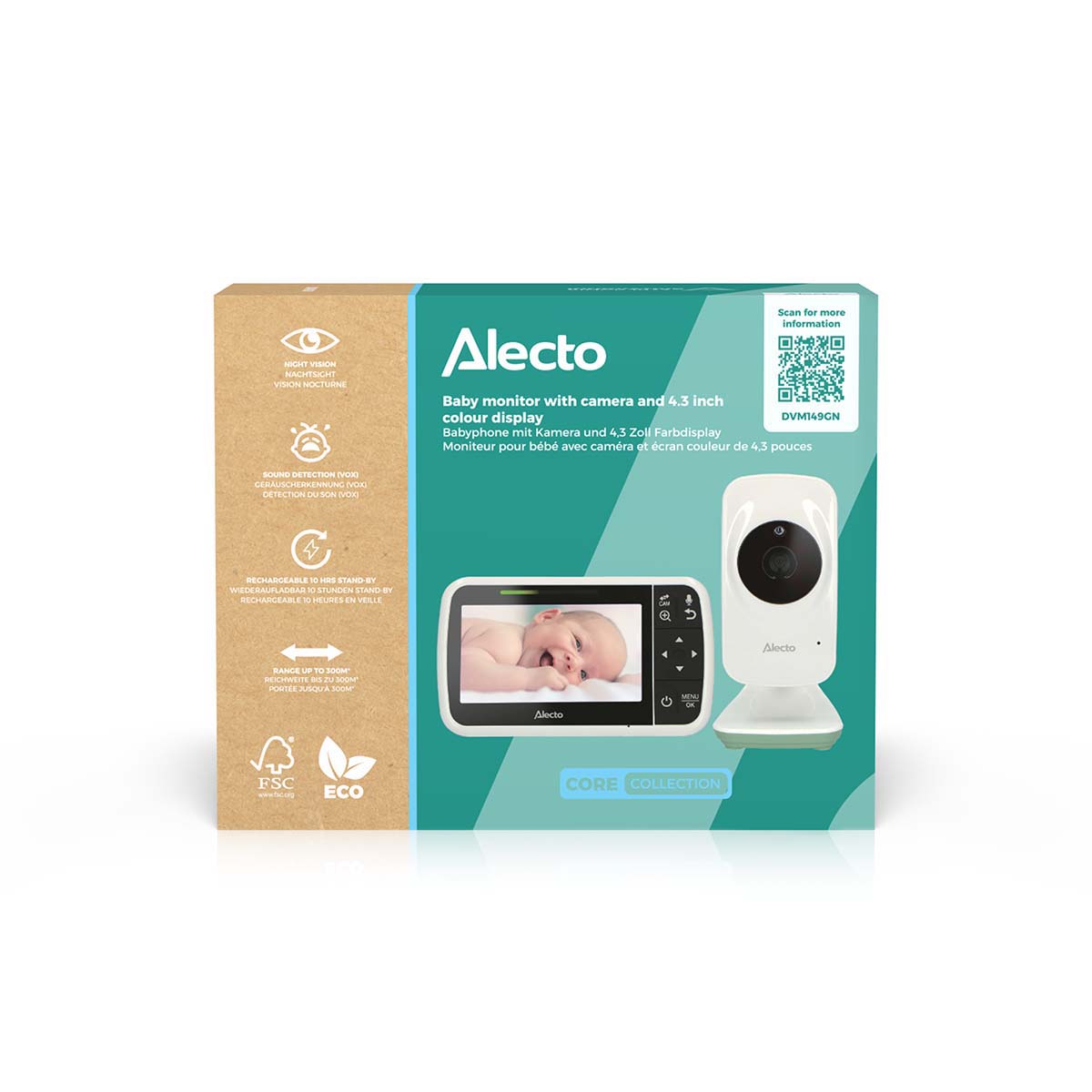 Alecto Baby’s DVM149GN baby monitor with camera always helps you keep a close eye on your child. This baby monitor consists of a camera and a large 4.3" screen, has the energy-saving Full Eco mode and is finished off in white/mint green.