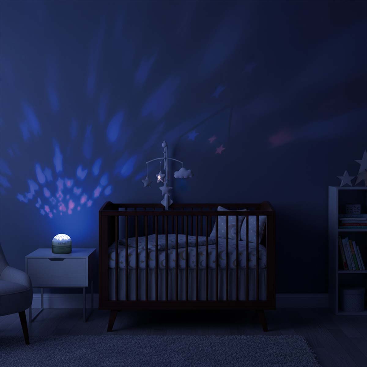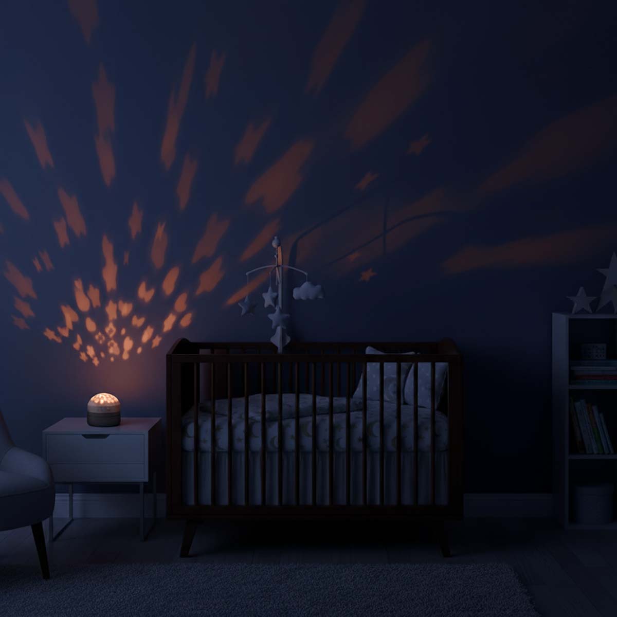 The Alecto BC130 white noise machine and projector combines soothing sounds and adjustable lighting to help your baby drift off peacefully. Its dual-colour projection in blue or orange offers seven brightness levels, while the magnetic base lets you easily adjust the projection angle for the perfect setup.
