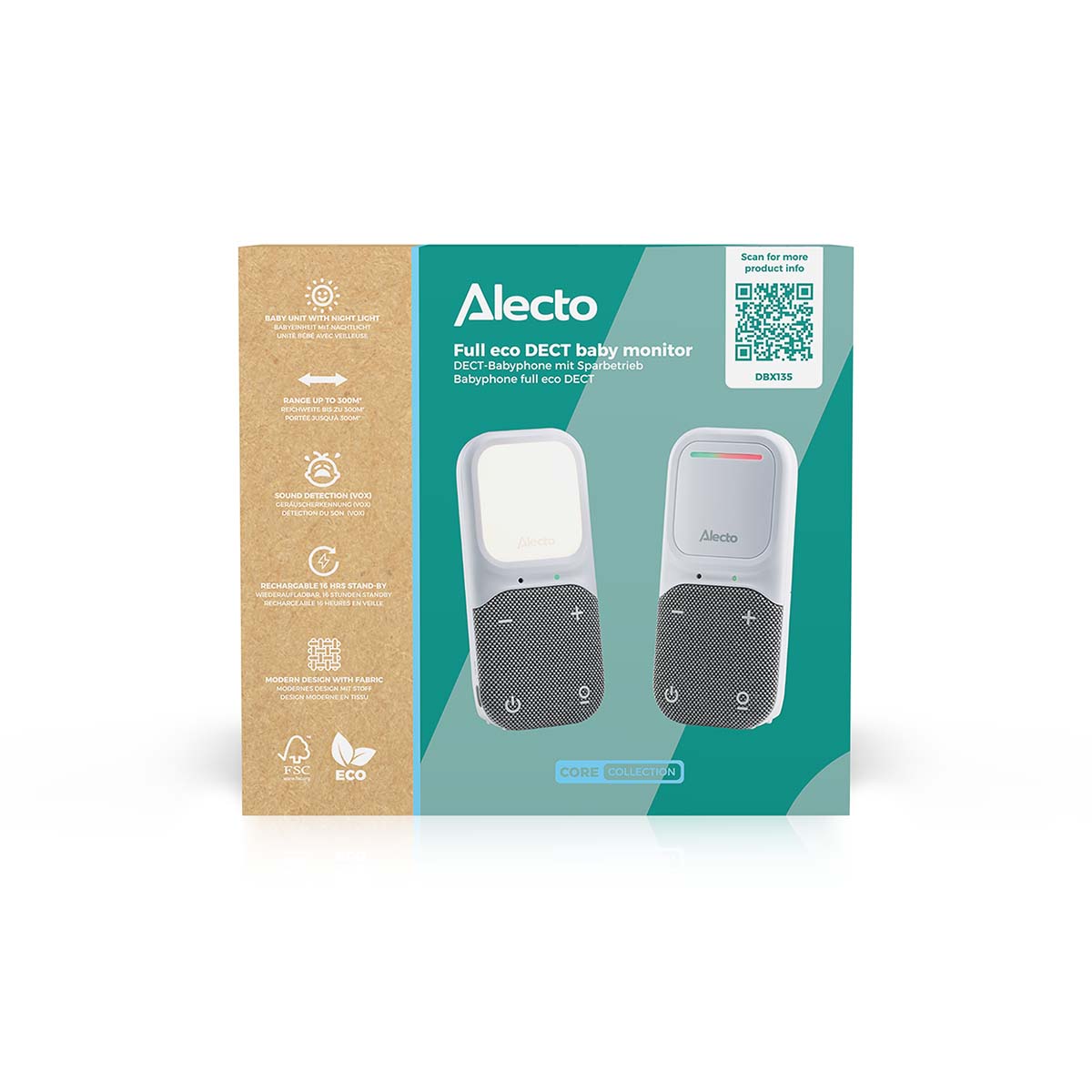 Avec le DBX135 de la nouvelle série de babyphones audio d’Alecto, vous apportez chez vous un babyphone fiable, moderne et polyvalent, doté de toutes les fonctionnalités nécessaires. Ce babyphone Full Eco DECT offre aux parents non seulement une qualité sonore cristalline, mais aussi une tranquillité d’esprit totale grâce à sa connexion 100 % sans interférences et sécurisée. Que vous soyez dans le jardin ou à un autre étage de la maison, avec la longue autonomie en veille et la grande portée du DBX135 d’Alecto, vous restez toujours connecté à votre enfant. Son design moderne avec tissu s’intègre parfaitement dans tous les intérieurs, tandis que l’indicateur LED pratique vous informe en un coup d’œil du niveau sonore dans la chambre de bébé. De plus, la sensibilité du microphone de l’unité bébé peut être ajustée selon vos préférences. La veilleuse intégrée sur l’unité bébé fournit juste assez de lumière pour surveiller votre enfant la nuit sans perturber son sommeil. En résumé, avec le DBX135 d’Alecto, vous choisissez un produit de haute qualité à un prix attractif.