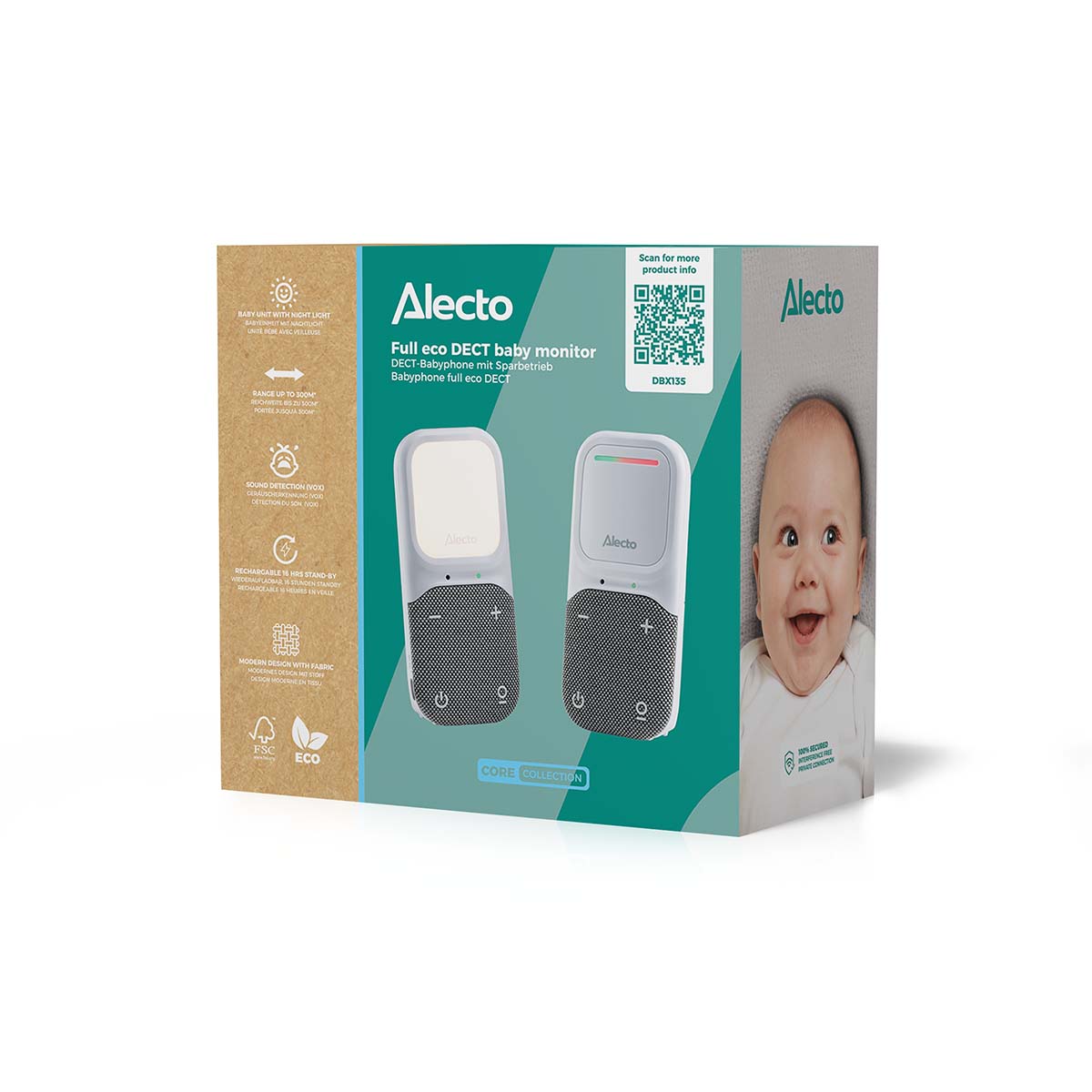 La technologie de communication utilisée par le DBX135, DECT 1,8 GHz, garantit une connexion stable et sécurisée entre l’unité bébé et l’unité parent. Vous n’avez donc pas à vous soucier des interférences ou des accès non autorisés : 100 % sans interférences et confidentialité garantie !