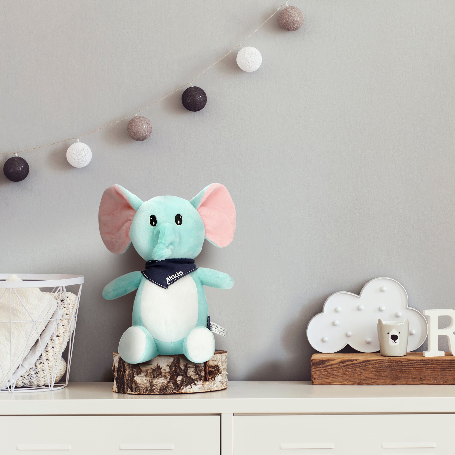 Votre enfant pourra poser cette peluche, en forme d’adorable éléphant, tout contre lui. Une veilleuse se trouve au niveau du ventre. Il suffit d’appuyer sur la patte pour l’allumer. Pour préserver les piles, la veilleuse s’éteint automatiquement au bout de 30 minutes. L’intensité des couleurs de la veilleuse est réglable (trois niveaux et position d’arrêt) en appuyant de nouveau sur la patte.