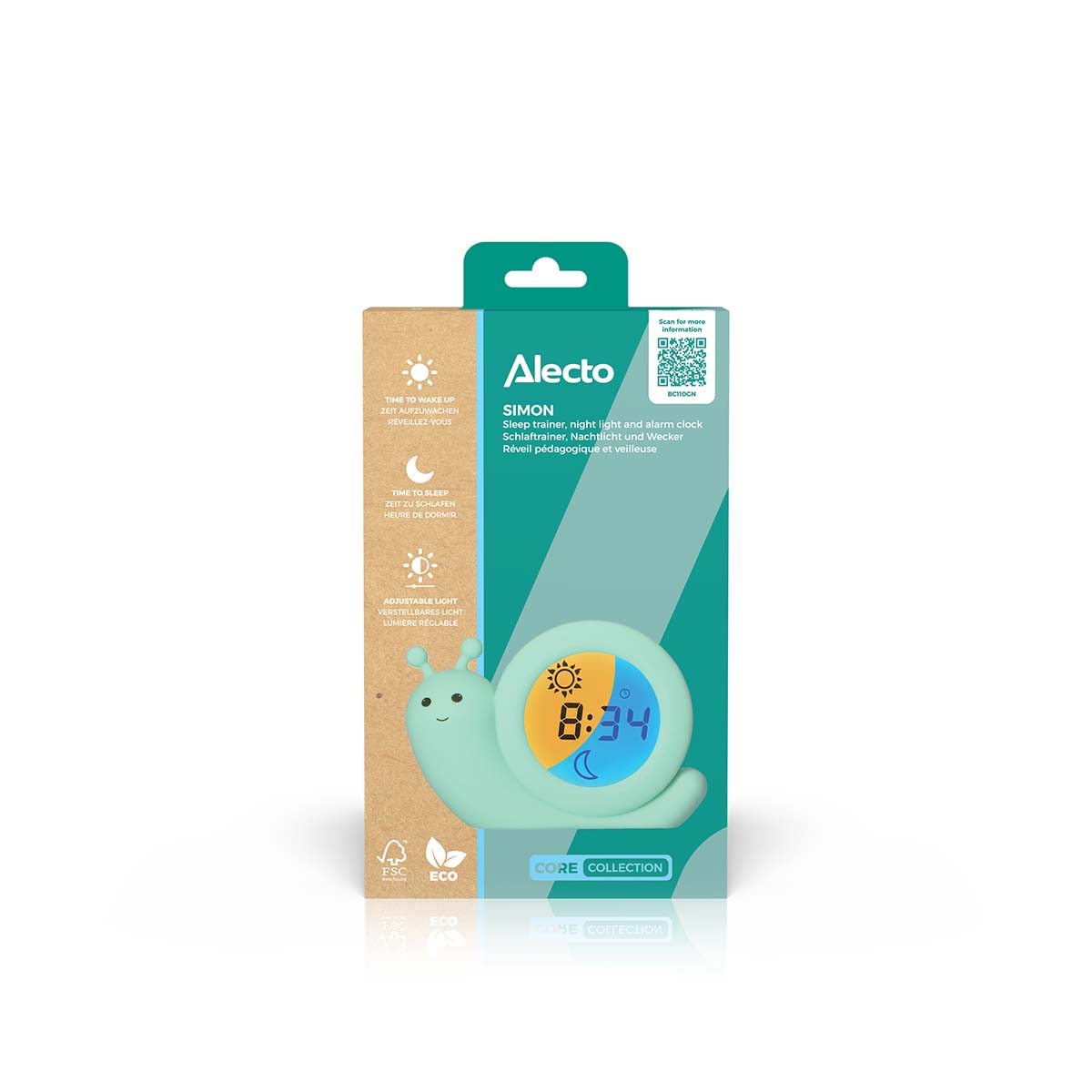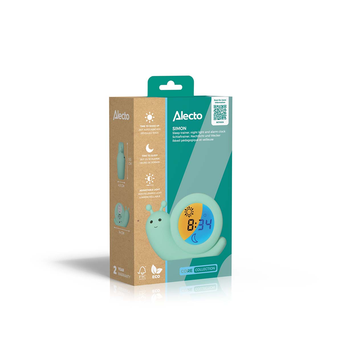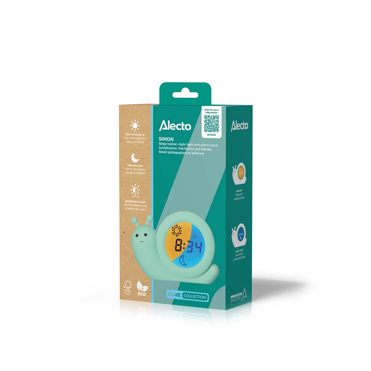 Le modèle BC110GN SIMON de la marque Alecto Baby est un produit deux-en-un : il s’agit à la fois d’un réveil pédagogique et d’une veilleuse. Ce, sous la forme d’un gentil escargot, du nom de Simon. Ce réveil pédagogique permet aux jeunes enfants d’acquérir la notion du temps. En tant que parent, vous définissez l’heure à laquelle votre enfant peut se lever. L’écran est de couleur bleue et affiche une lune ? C’est le signe qu’il est l’heure d’aller se coucher. Il est l’heure de se lever ? L’écran du réveil BC110GN SIMON est de couleur orange et affiche un soleil. Le réveil BC110GN SIMON est livré avec un câble de chargement de très grande longueur (200 cm), il est également rechargeable, il est donc mobile et peut être utilisé sans fil.