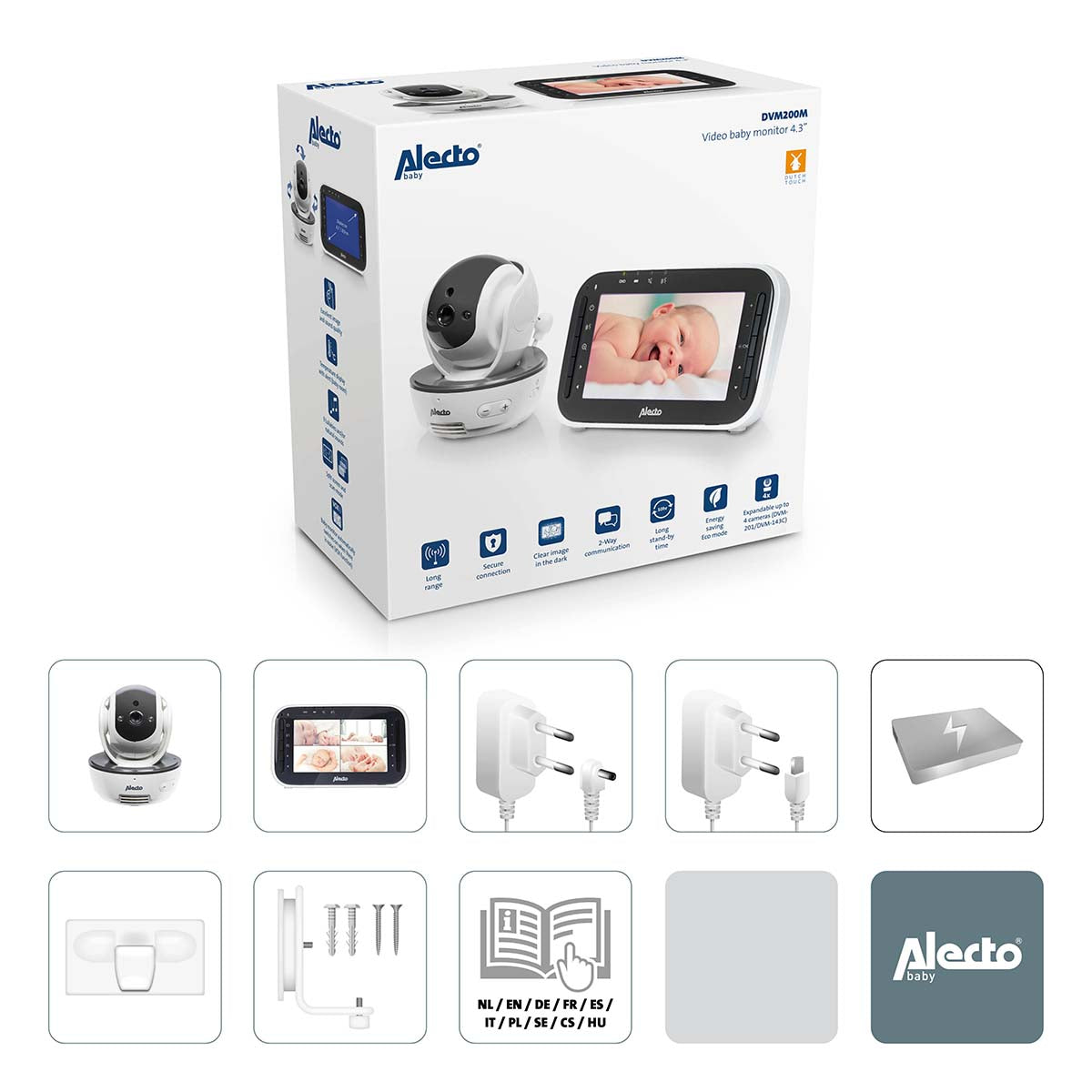 Vous pouvez facilement ajouter jusqu’à quatre caméras au babyphone avec caméra Alecto Baby DVM200MBK (la caméra DVM200C supplémentaire est disponible séparément). La caméra DVM200C dispose des mêmes possibilités que la caméra du babyphone DVM200MBK. De plus, toutes les caméras peuvent être commandées depuis un grand écran. Ensemble ou séparément via le mode d’écran divisé. Cela est pratique si vous souhaitez observer votre enfant depuis différents angles ou si votre enfant dort souvent dans différents endroits. Mais également si vous souhaitez surveiller plusieurs enfants ou plusieurs pièces.