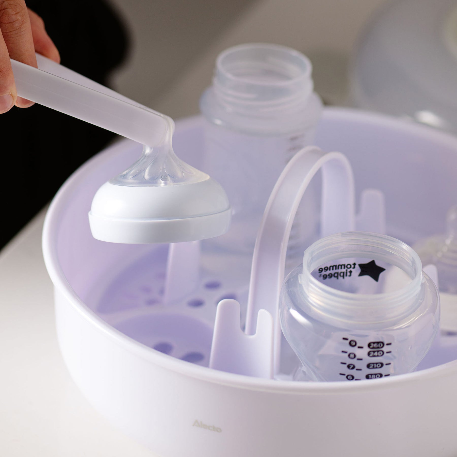 Met deze fles sterilisator maak je flessen en spenen in een handomdraai schoon, zónder schoonmaakmiddelen. De fles sterilisator werkt met stoom en doodt 99,9% van alle bacteriën. Als je flesvoeding geeft of gekolfde melk, gaan er zo vier tot zes flesjes door op een dag. Dat is een heleboel schoonmaakwerk, dat je ook aan de fles sterilisator kunt overlaten. Binnen een minuut of zes zijn je flessen weer klaar voor gebruik en jij hebt er geen omkijken naar. Heerlijk!